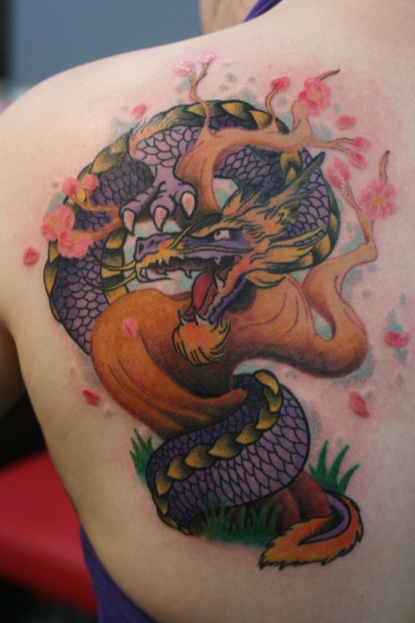 背部插画风格彩色龙绕树纹身图案