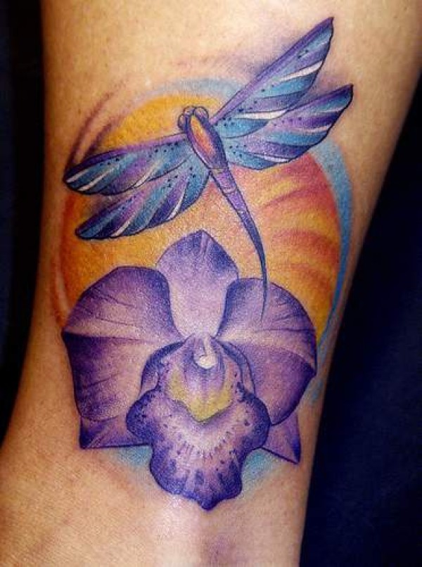 夕阳下的蜻蜓和紫色花朵纹身图案