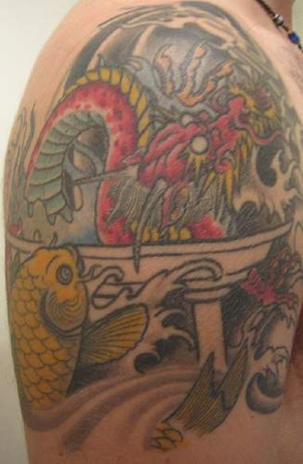 黄色锦鲤和红色的龙纹身图案