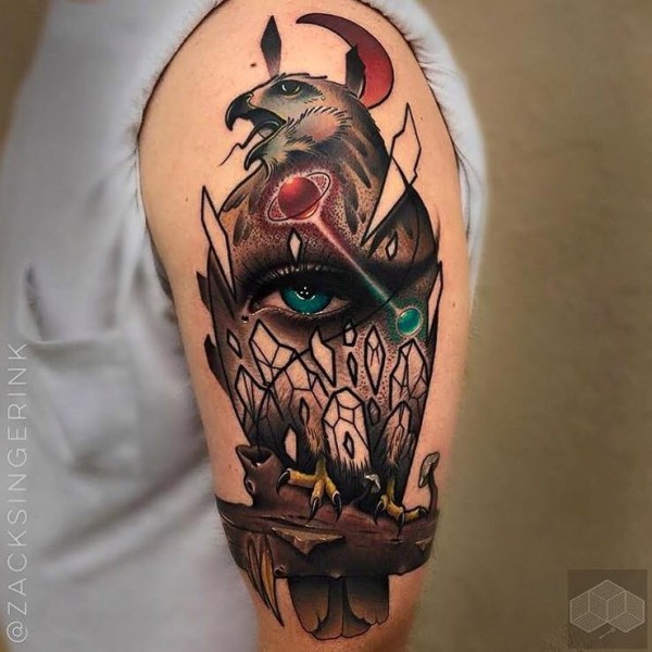 new school彩色鹰与神秘的写实眼睛纹身图案