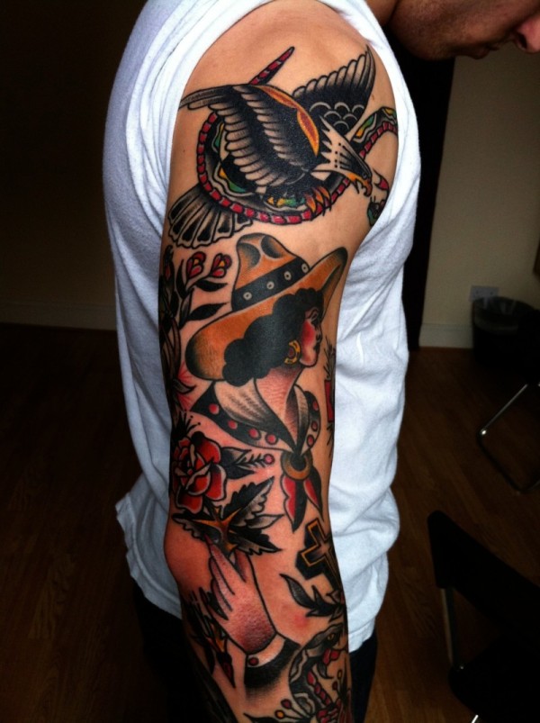old school彩色墨西哥女性与鹰和玫瑰纹身图案