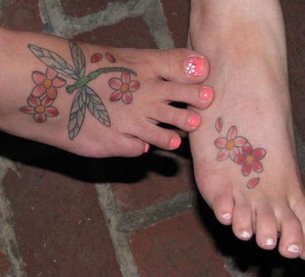 脚背绿蜻蜓和红色花朵纹身图案