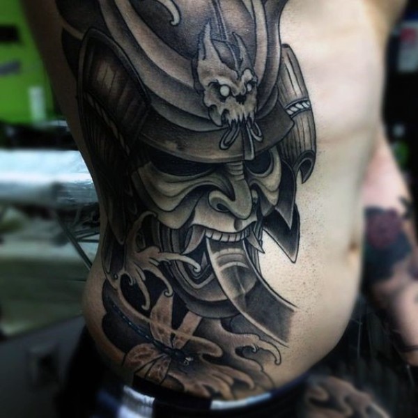 男士侧肋彩色武士面具蜻蜓纹身图案