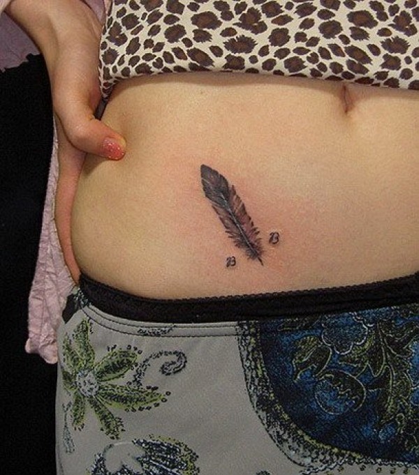 女孩腰部简单可爱的羽毛纹身图