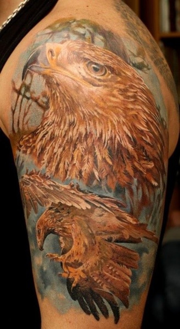 现实主义风格彩色鹰大臂纹身图案