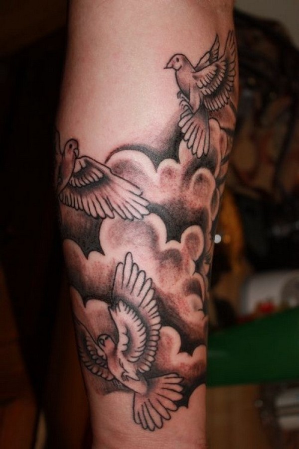 胳膊黑灰风格鸟儿和云朵纹身图案