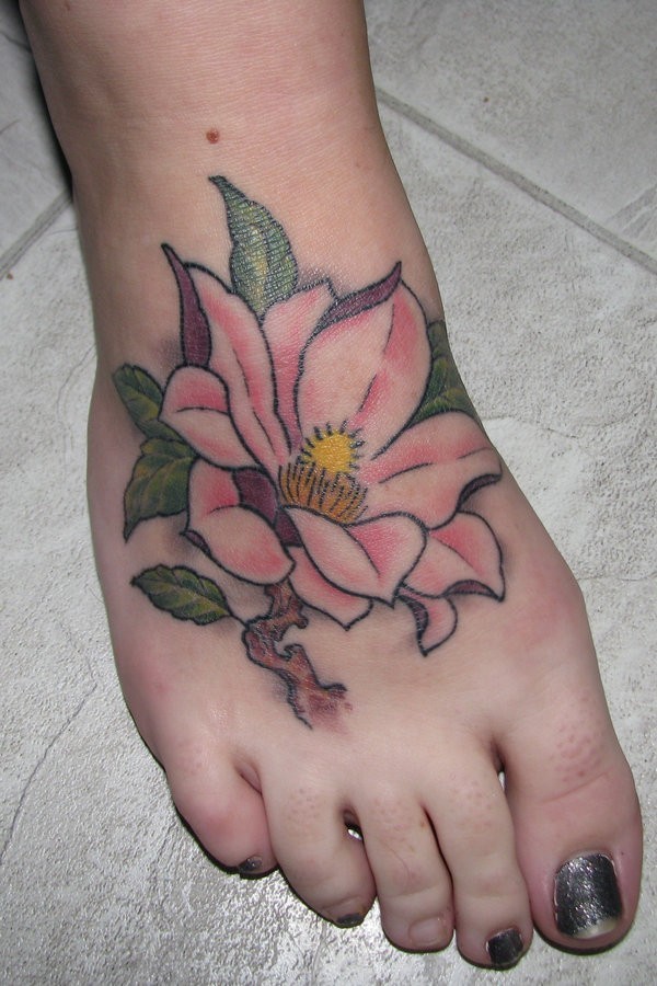 脚背优雅淡粉色木兰花纹身图案