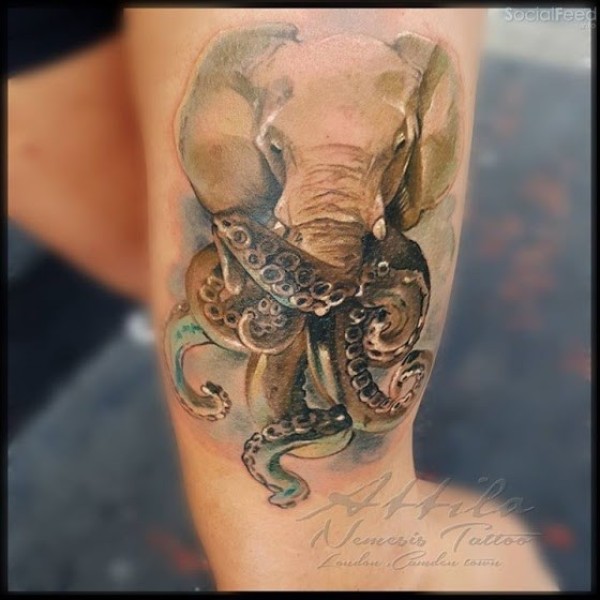 大腿现实主义风格彩色大象与章鱼纹身图案