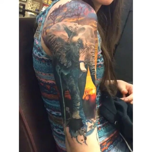 女生大臂现实主义风格写实彩色大象纹身图案