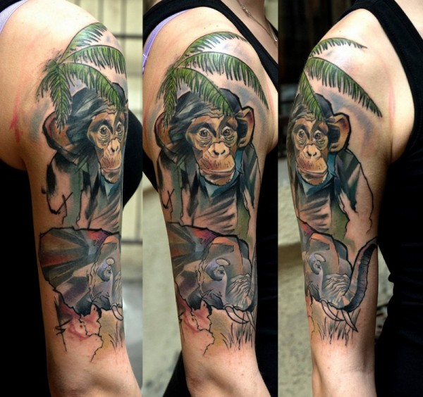胳膊写实彩色猴与棕榈树和大象纹身图案