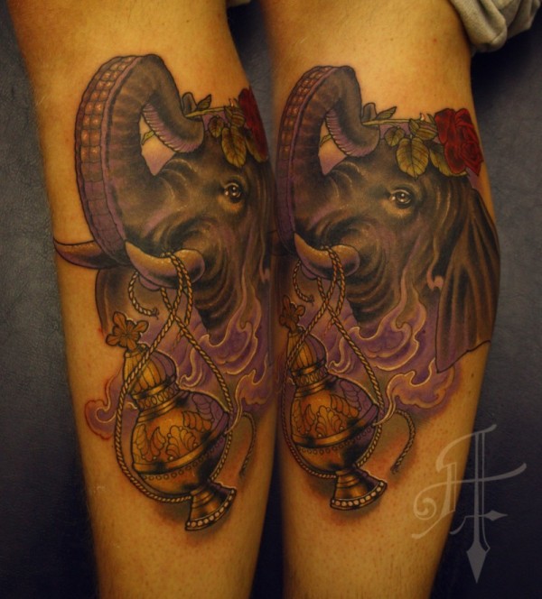 小腿彩色大象与灯玫瑰纹身图案