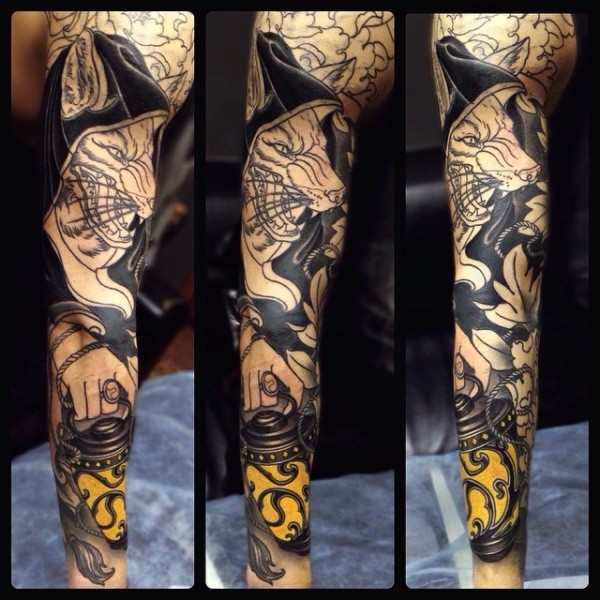 胳膊彩色彩色邪恶的狐狸与打火机纹身图案