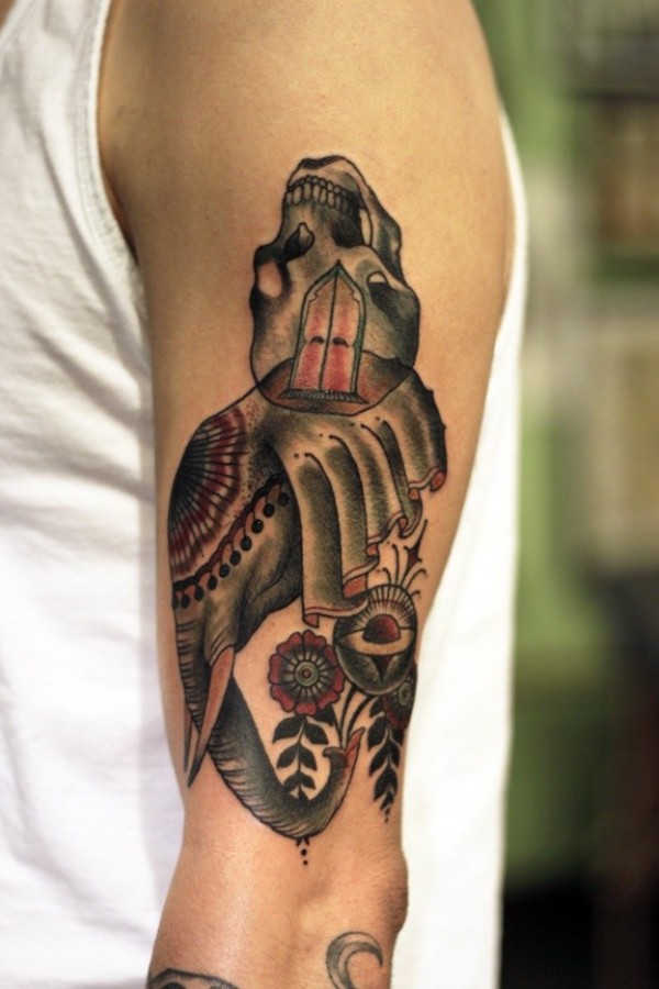 手臂school小巧优雅的花和象头纹身图案