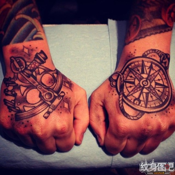 双手手背指南针纹身