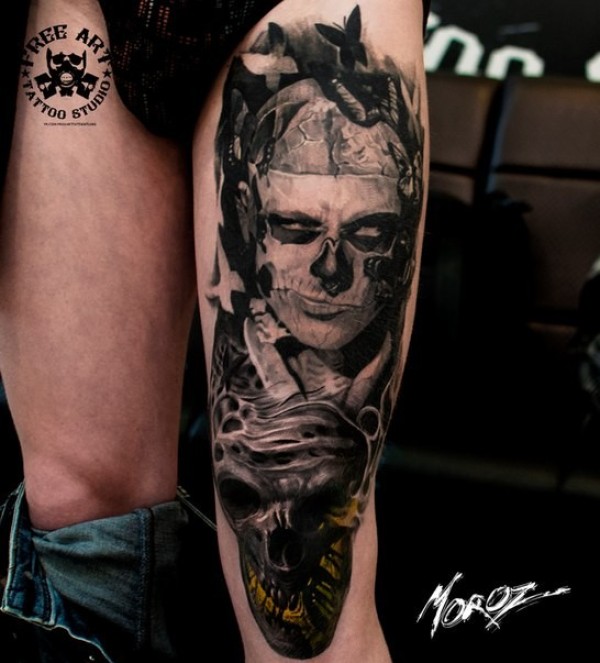 大腿写实风格彩色邪恶男子和骷髅纹身图案