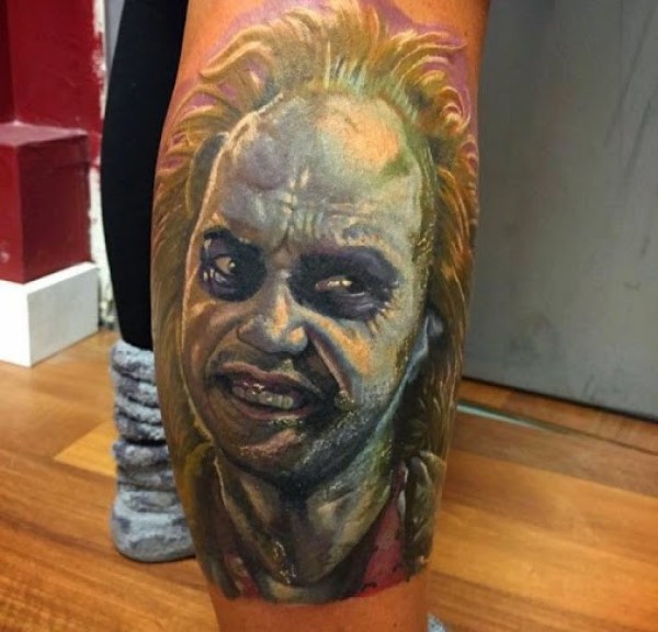腿部彩色恐怖风格邪恶怪物肖像纹身图案