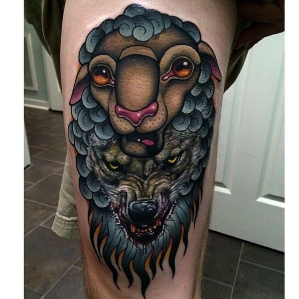 大腿现代风格彩色邪恶狼与羊纹身图案