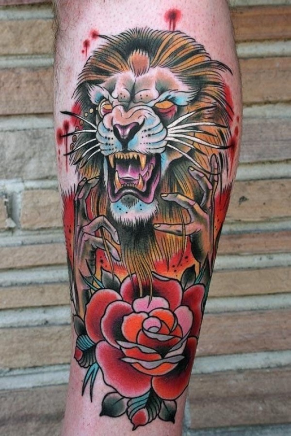 old school彩色邪恶狮子与玫瑰纹身图案