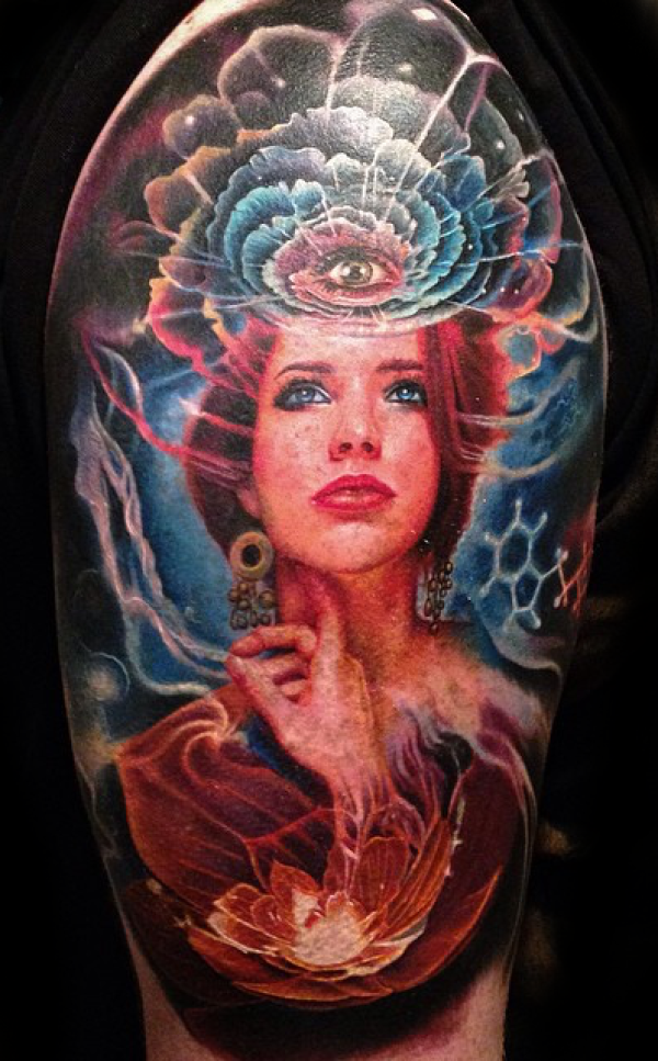 彩色美女肖像和梵花眼睛纹身图案