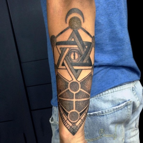 手臂点刺眼睛与六芒星纹身图案