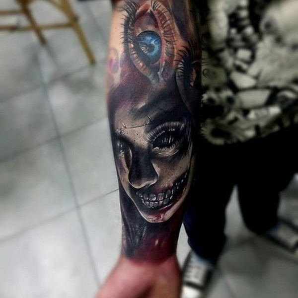 手臂new school彩色眼睛和毛骨悚然的僵尸女人纹身图案