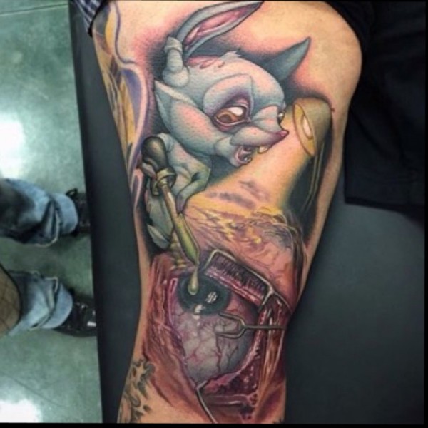 彩色恐怖风格卡通老鼠与写实眼睛纹身图案