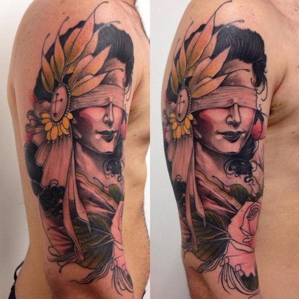 胳膊old school彩色蒙住眼睛的女生肖像纹身图案