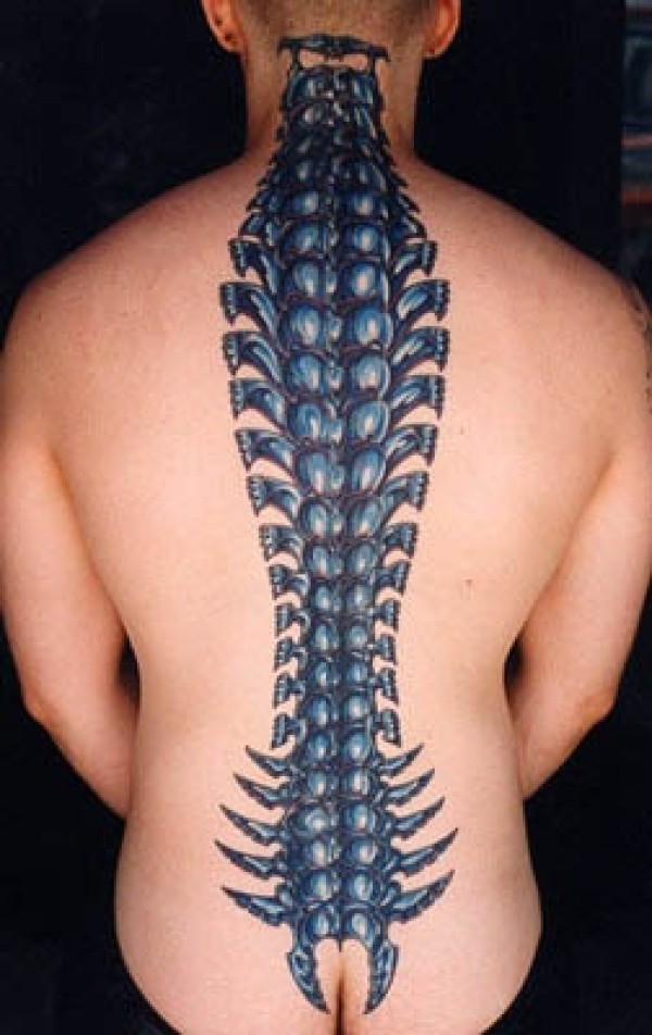 男性背部脊椎骨之彩色纹身图案