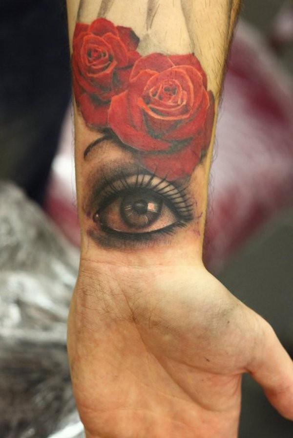 手腕写实红色玫瑰与神秘的眼睛纹身图案