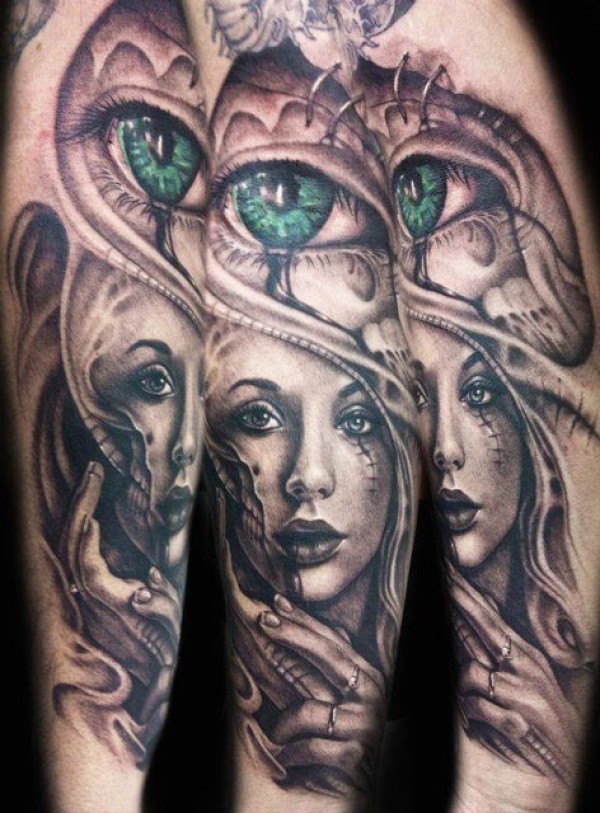 手臂彩绘女性肖像与绿色眼睛纹身图案
