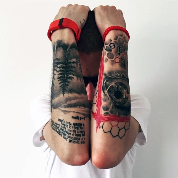手臂彩色令人毛骨悚然的眼睛与森林字母纹身图案