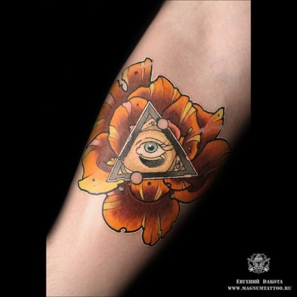 现代传统风格彩色花朵与三角形和眼睛纹身图案