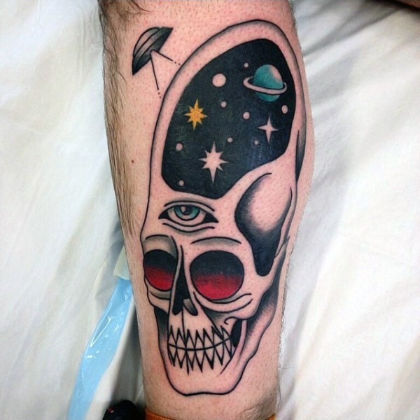 小腿有趣的彩绘骷髅与眼睛星空纹身图案