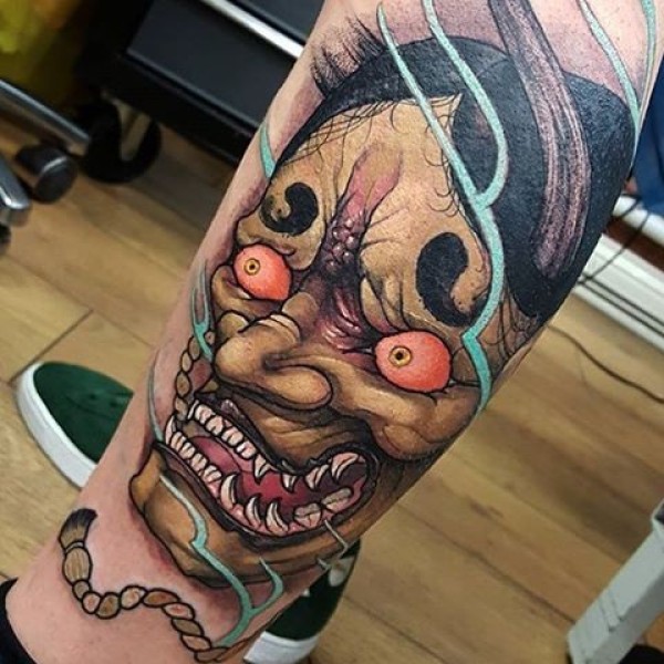 小腿日式彩色般若个性纹身图案