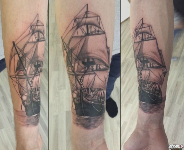 小臂内侧黑灰的帆船纹身
