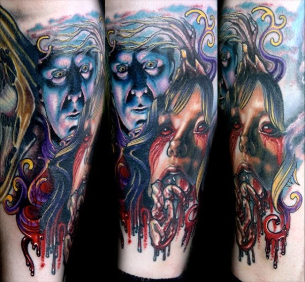 恐怖风格令人毛骨悚然的女人与怪物脸纹身图案