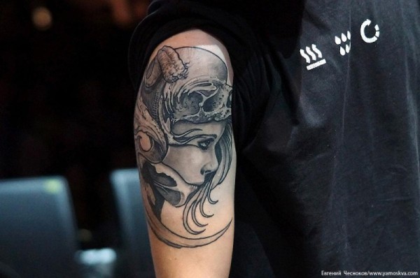 大臂幻想风格女生脸与骷髅头盔纹身图案