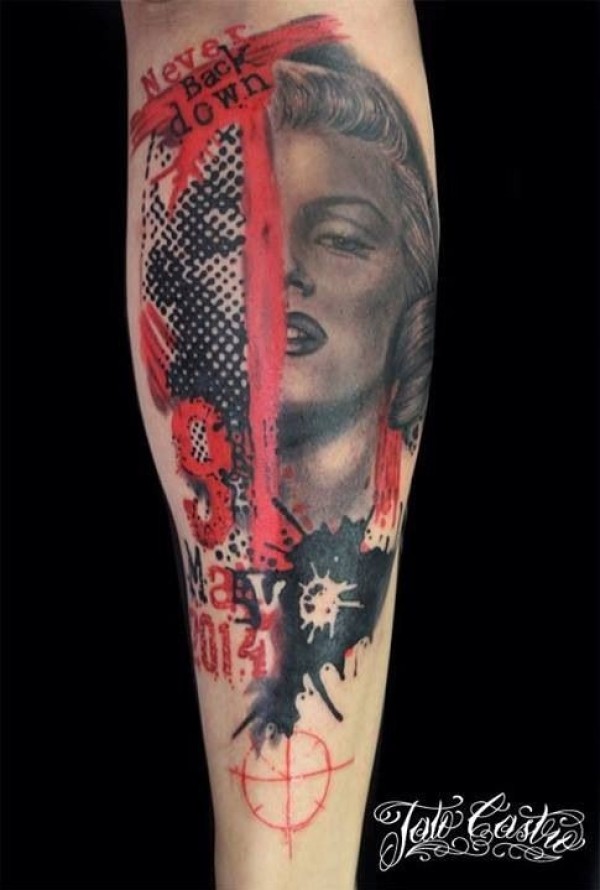小臂水彩画风格玛丽莲梦露半脸肖像纹身图案
