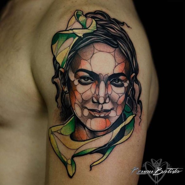 大臂彩色肩微笑女人脸纹身图案