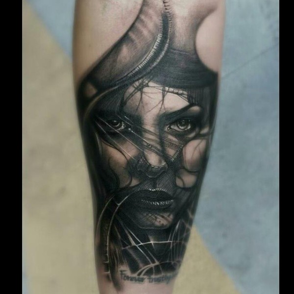 小腿现实主义风格彩色神秘女人脸纹身图案