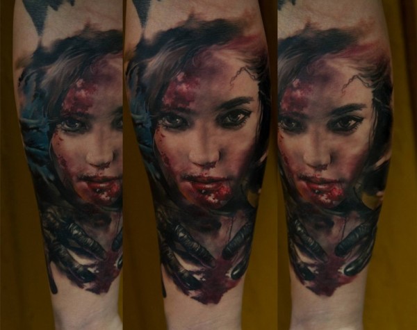 小臂彩色恐怖风格血腥女人脸纹身图案
