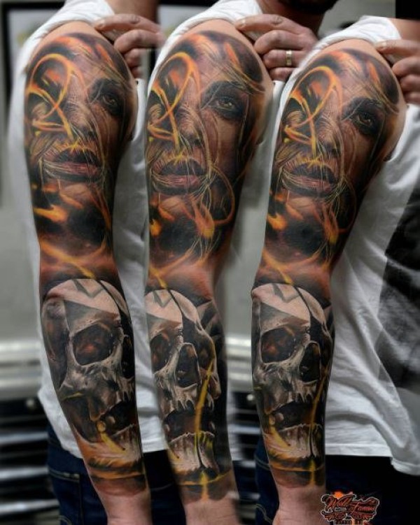 男士手臂恐怖风格彩色神秘女人脸和骷髅纹身图案