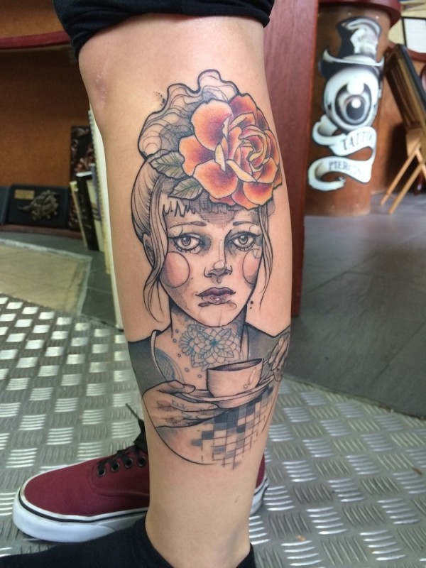小腿素描风格的彩色漂亮女生鲜花和茶杯纹身图案