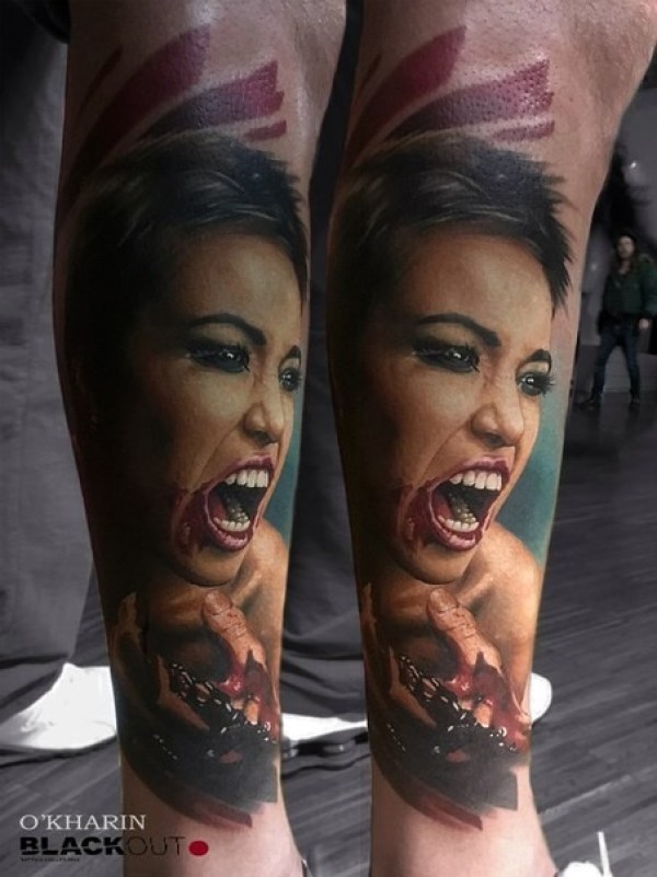 小腿彩色恐怖风格血腥女人脸纹身图案