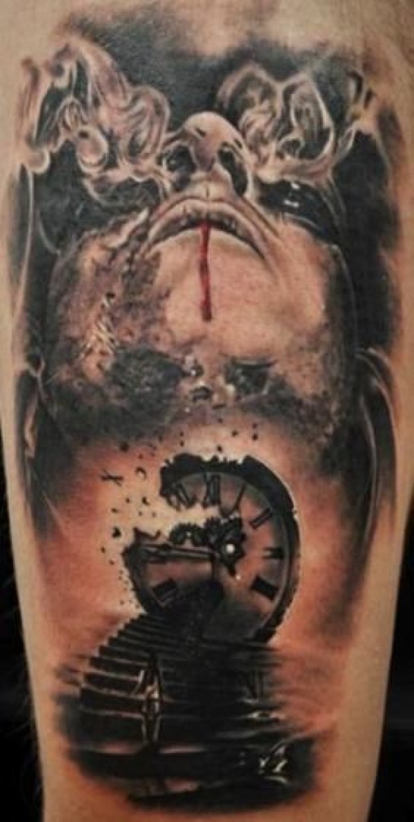 彩色恐怖风格流血的人脸与时钟楼梯纹身图案