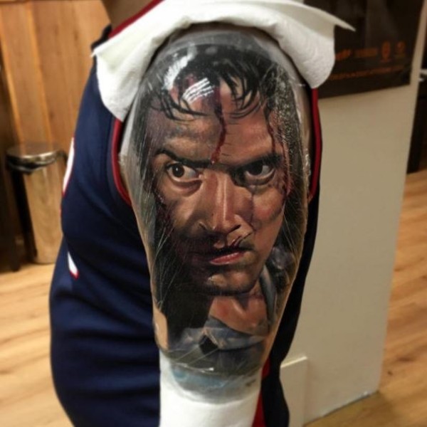 彩色恐怖风格手臂流血男子肖像纹身图案