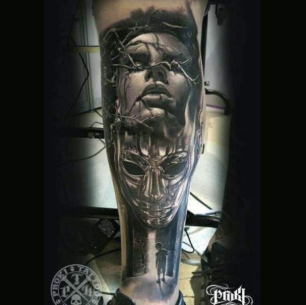 小腿彩色恐怖风格女生肖像与藤蔓面具纹身图案