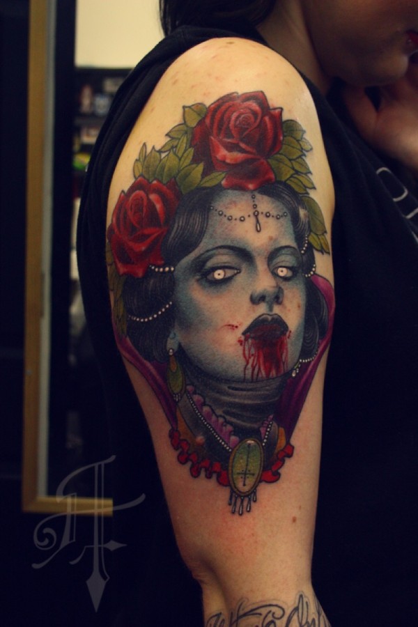 大臂彩色令人毛骨悚然的血腥女人脸与玫瑰纹身图案