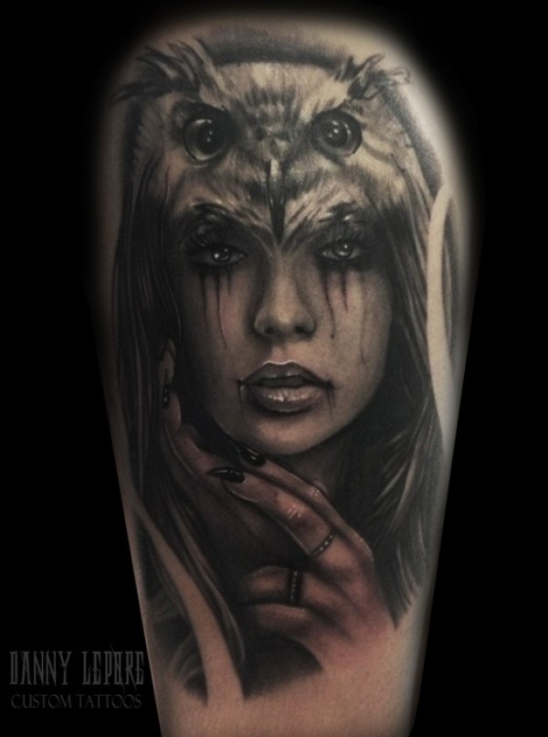令人印象深刻的女人脸与猫头鹰纹身图案