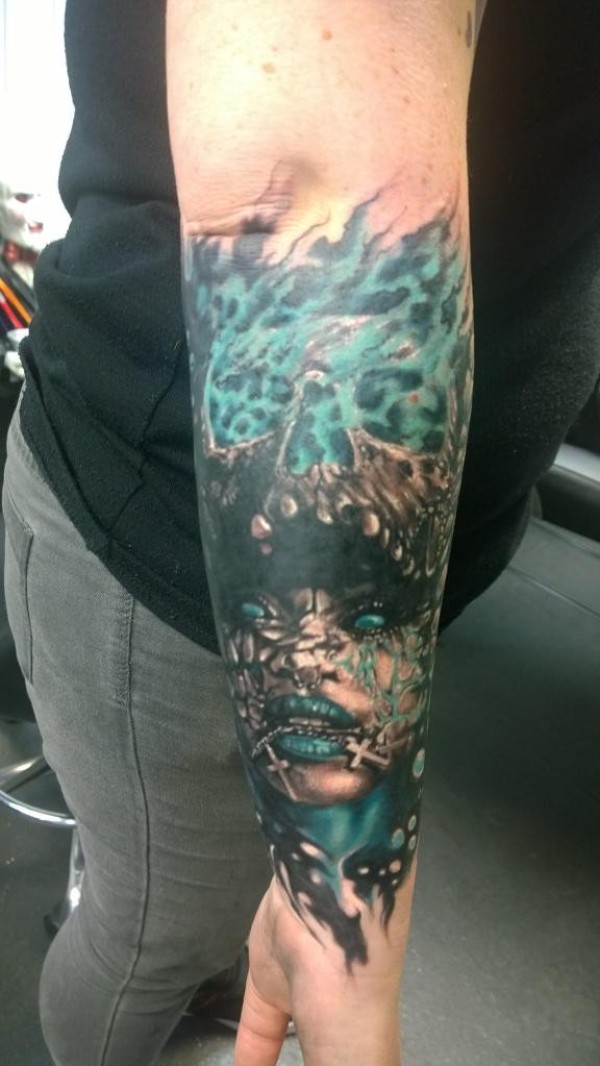 小臂梦幻风格彩色燃烧的骷髅与女人脸纹身图案